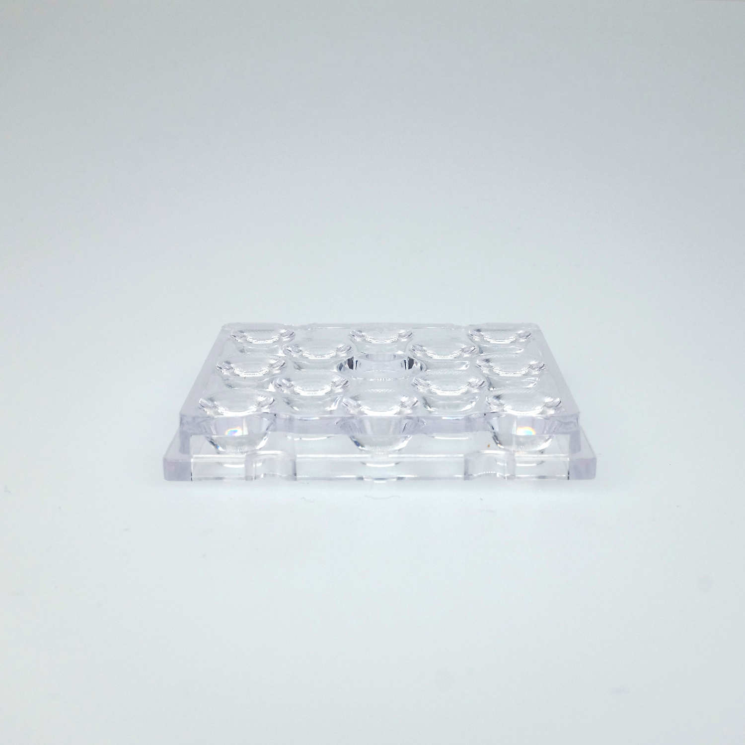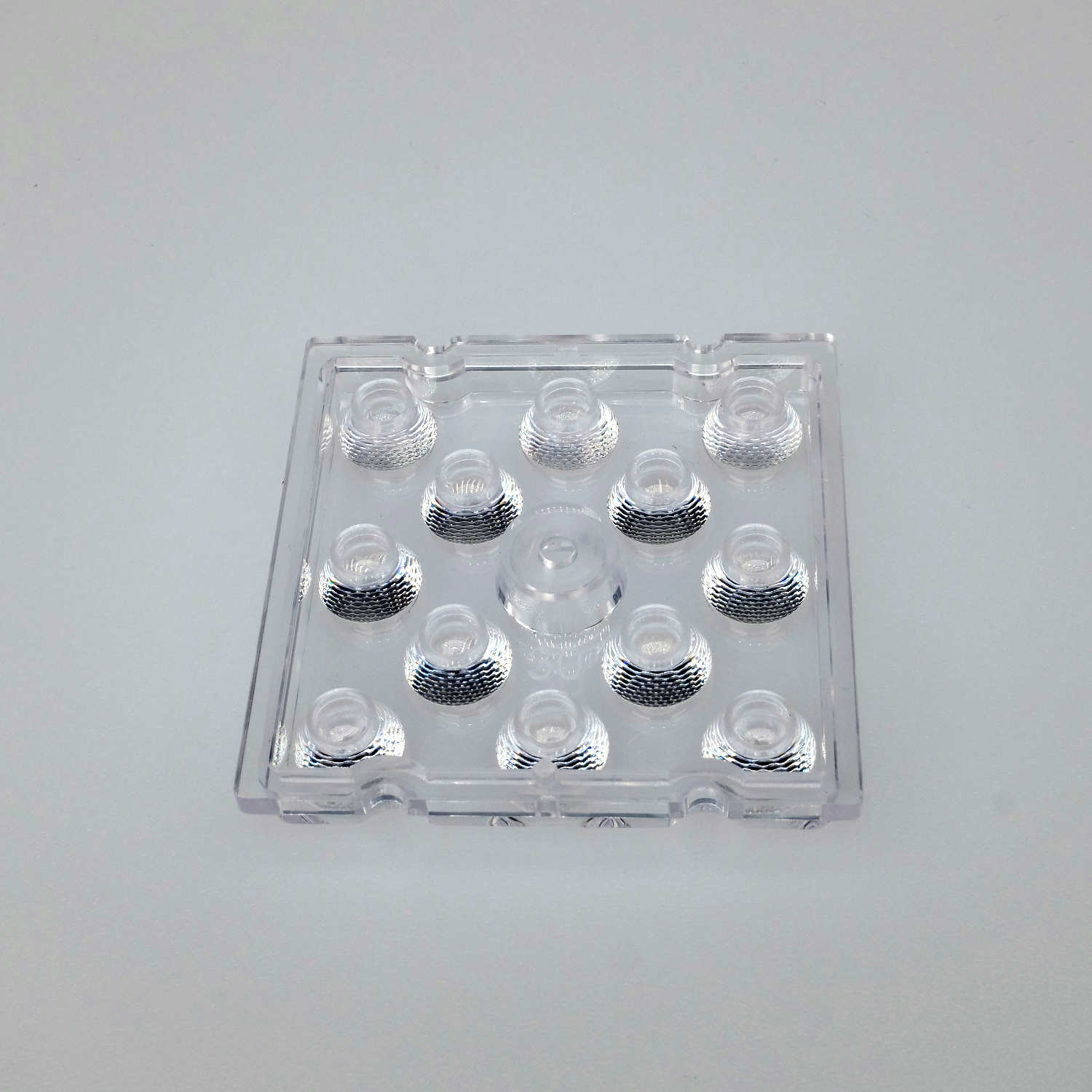 Ein übliches 50x50mm Linsen-Array mit 12 Einzellinsen mit einem Abstrahlwinkel von 30°. Vorzugsweise für Straßenlaternen, Arbeitsleuchten oder kleine Flutlichter geeignet.