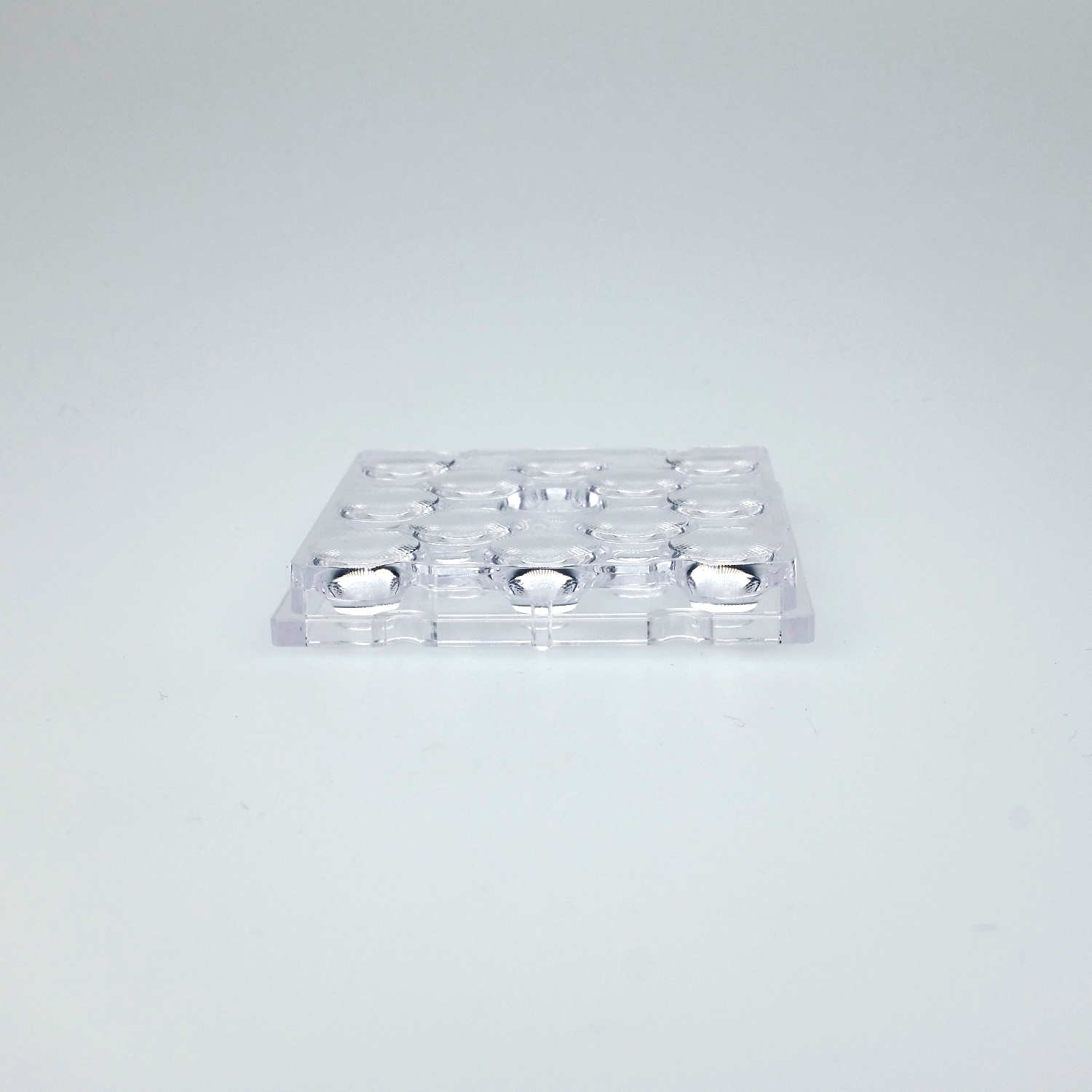 Ein übliches 50x50mm Linsen-Array mit 12 Einzellinsen mit einem Abstrahlwinkel von 30°. Vorzugsweise für Straßenlaternen, Arbeitsleuchten oder kleine Flutlichter geeignet.
